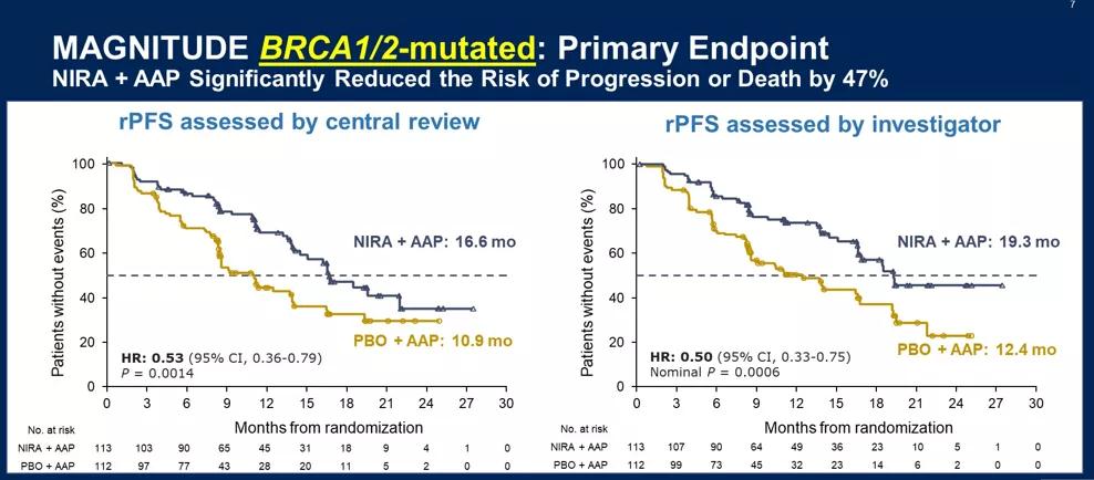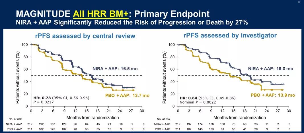 [2]Phase 3 MAGNITUDE study: First results of niraparib (NIRA) with abiraterone acetate and prednisone (AAP) as first-line therapy in patients (pts) with metastatic castration-resistant prostate cancer (mCRPC) with and without homologous recombination repair (HRR) gene alterations.ASCO-GU2022,Abstract #12