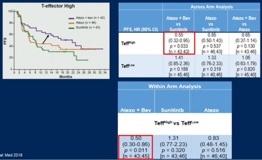 其中,她首先讨论了基因表达特征,特别是基于IMmotion150试验中可能预测联合免疫检查点抑制和酪氨酸激酶抑制剂疗效的免疫特征。该研究的相关分析表明,阿替利珠单抗联合贝伐珠单抗在效应T细胞基因特征较高(TeffHigh) 的患者中疗效更好。
