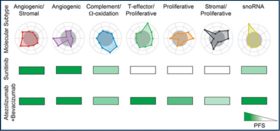 IMmotion151试验的转录组学分析则明确了七个不同的分子亚群,包括血管生成/基质、血管生成、补体/Ω-氧化、T-效应/增殖、增殖、基质/增殖和snoRNA。