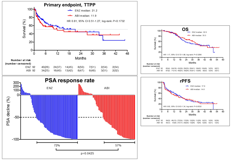 该结果显示:相较于阿比特龙组,恩扎卢胺组的至PSA进展时间延长了近10个月(21.2 vs 11.9个月;HR 0.81,95%CI:0.51~1.27,P=0.1732),PSA应答率有显著提高(72% vs 57%,P=0.0425);两组的中位OS(32.9和35.5个月)和rPFS(17.6 vs 14.0个月)没有显著差异;但是恩扎卢胺组在安全性方面表现更好,≥3级AE发生率比阿比特龙组更低(11% vs 21%)。该研究表明,尽管阿比特龙和恩扎卢胺在生存获益方面无显著差异,但在PSA缓解率、安全性等方面恩扎卢胺表现更加优异,支持在亚洲人群中将恩扎卢胺用于阿比特龙之前。
