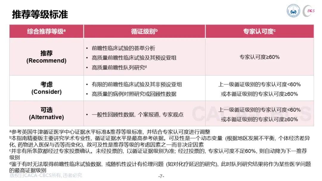第一,为更好的让读者理解指南内容,“小红书”把推荐等级表格纳入其中。我们将临床个体化诊疗中有争议的问题进行汇总,并让相关专家投票表决,对专家认可度超过60%,同时有高质量的队列研究数据佐证的方案进行推荐。