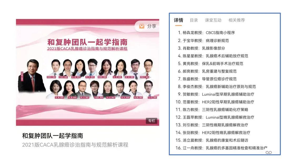 2021版CACA-CBCS指南发布后,在邵教授教授的带领下,复旦大学附属肿瘤医院多学科团队的中青年医生对指南进行了全面的解读。每位专家针对指南的不同部分录制了约20分钟的视频,大家可以在网上搜索“和复肿一起学指南”进行观看,希望各位同道在与我们一起学指南的过程中,能更好地、全面地理解指南,以更好的在临床应用。