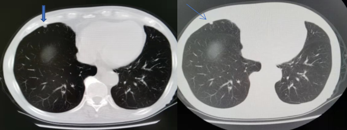 2020年7月17日胸部CT:右中肺新发小结节,考虑转移。根据患者意见未行治疗,继续随诊。