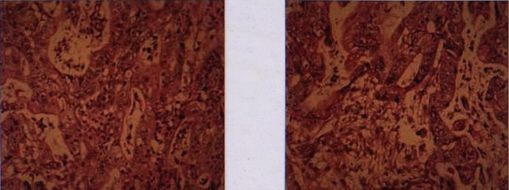 免疫组化结果显示:CK(+),Ki67(10%),CK8/18(+),TIF-1(-),NAPSIN A(+),CK7(+),CK5/6-,P40-,SYN-,CGA-,CD56-,CDX-2-,CK20-。(患者因自身原因术后未行HER2检测)于2021年3月补充免疫组化:Her-2(3+)。