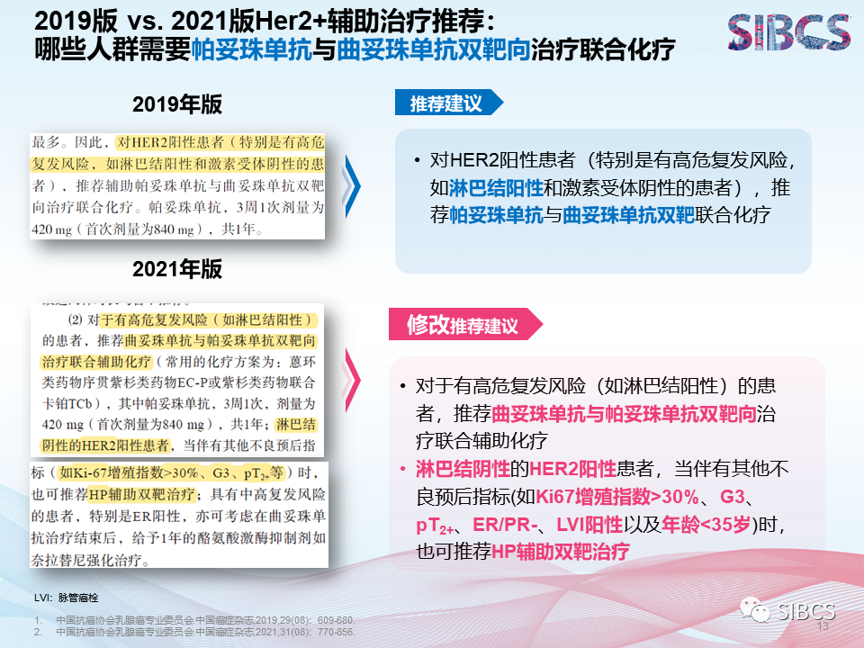对于双靶的最佳化疗搭档到底是含蒽环还是不含蒽环,也就是应该选择TCbHP(PCbHP)还是AC-THP(EC-THP)方案?我认为应该从新辅助治疗的目的来看。如果是以实现降期手术(包括不可手术变为可手术、保乳、保腋窝)为目的,那么选择TCBHP有助于快速降低肿瘤负荷,这也是指南推荐的新辅助治疗首选人群;如果是以新辅助治疗平台来提供药敏信息为目的,这类患者往往肿瘤负荷较小,是新辅助治疗的可选人群,这类患者选择TCBHP或者AC-THP均可,但后者的证据更充分,既有紫杉类也有蒽环类,提供的药敏信息也更多。以上CBCS指南关于HER2阳性乳腺癌新辅助治疗的重要转变,有助于让大家更好地理解“首选”和“可选”人群及方案的内涵。
