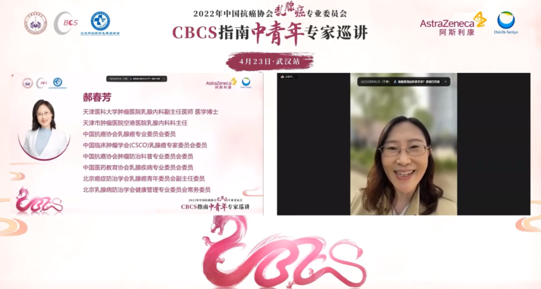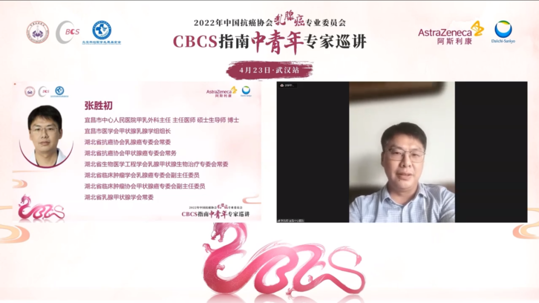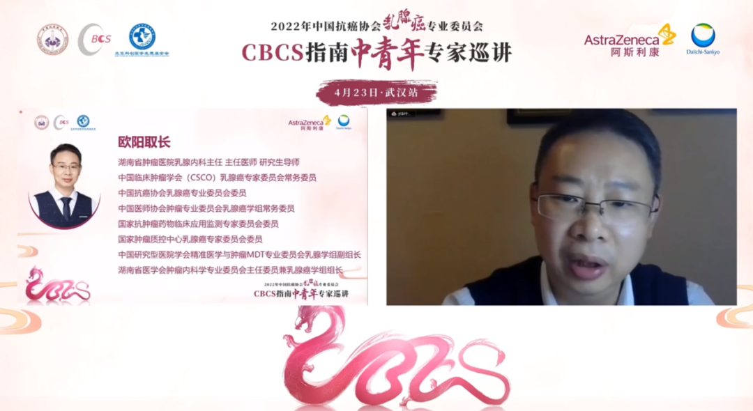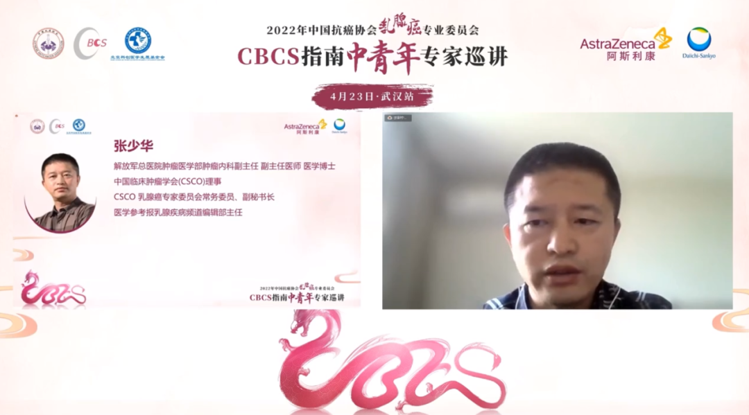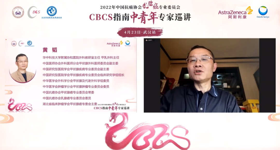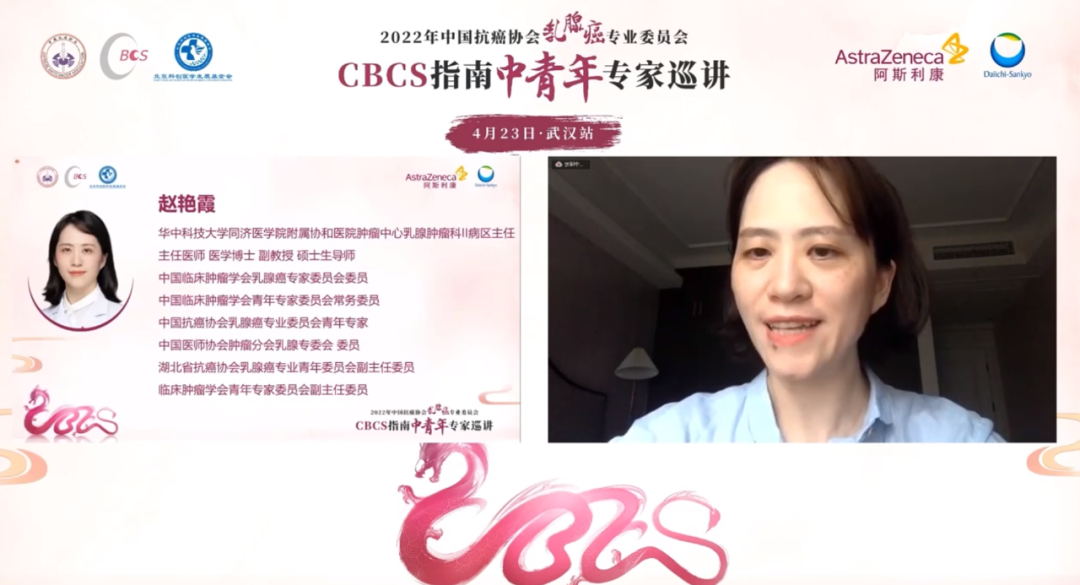 编者按:2022年中国抗癌协会乳腺癌专业委员会CBCS指南中青年专家巡讲——武汉站于4月23日圆满落幕。本次会议由中国抗癌协会乳腺癌专业委员会、北京科创医学发展基金会主办,华中科技大学同济医学院附属协和医院承办。在名誉主席黄韬教授、程晶教授,飞行主席郝春芳教授和云端主席余科达教授,特邀主席吴新红教授、李兴睿教授、姚峰教授,执行主席赵艳霞教授组成的大会主席团带领下,上半场与会专家就CBCS指南内容进行了解读和讨论,下半场各位专家学者就各亚型乳腺癌患者的治疗进行了病例讨论与分享。