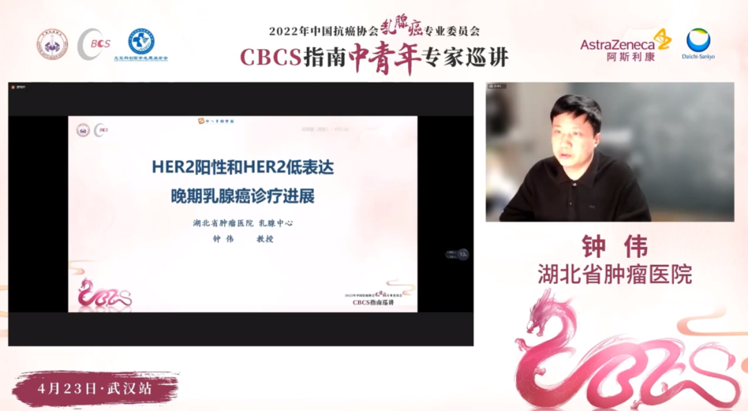 在武汉大学人民医院姚峰教授的主持下,湖北省肿瘤医院钟伟教授带来了“HER2阳性与HER2低表达晚期乳腺癌诊疗进展”的讲课,在讲课中他提到,随着大分子单抗、TKI等抗HER2治疗的出现,HER2阳性乳腺癌患者的治疗得到了改善,但随着治疗线数的增加,患者的生存时间也在逐渐减少,新型ADC药物DS-8201的出现改写了HER2阳性乳腺癌的治疗格局,也使得晚期HER2阳性乳腺癌患者的看到了更多生存希望,此外,DS-8201在脑转移和HER2低表达的乳腺癌患者中也有较好的疗效。因此,2021 ESMO指南、2022 NCCN/ABC6/CSCO 等多项指南推荐DS-8201作为HER2阳性晚期乳腺癌二线治疗优选方案。最后,钟伟教授总结:技术的进步为ADC疗法带来了翻天地覆的变化,ADC药物的出现点亮了癌症治疗的未来。