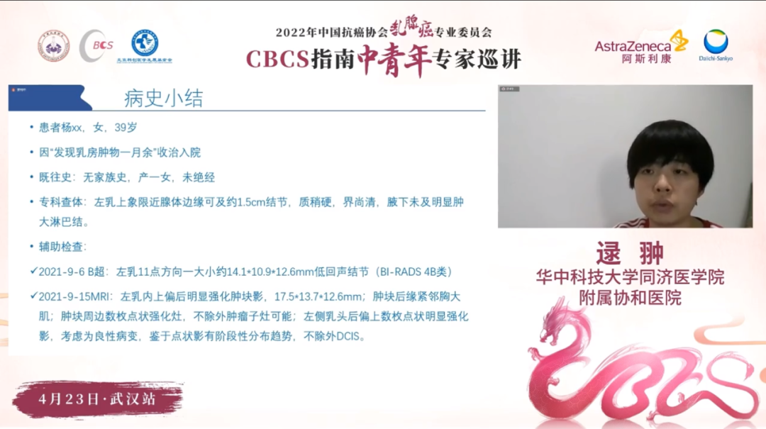 在华中科技大学同济医学院附属协和医院刘春萍教授的主持下,华中科技大学同济医学院附属协和医院逯翀教授分享了“TNBC早期乳腺癌患者诊疗的病例”。