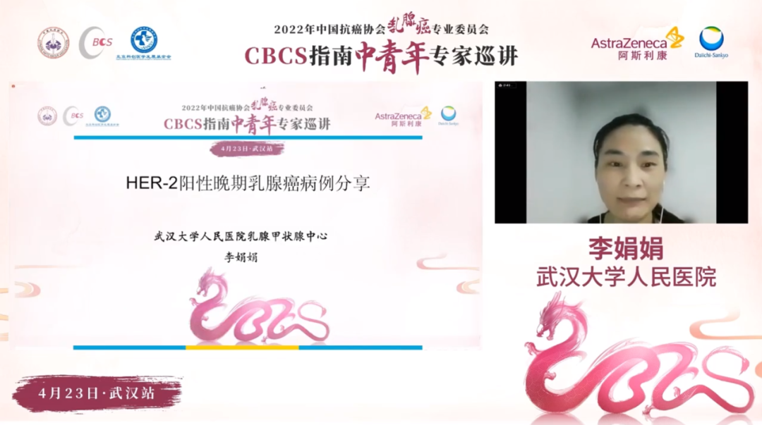 在宜昌市中心人民医院张胜初教授的主持下,武汉大学人民医院李娟娟教授带来了“HER2+晚期乳腺癌的病例分享”。