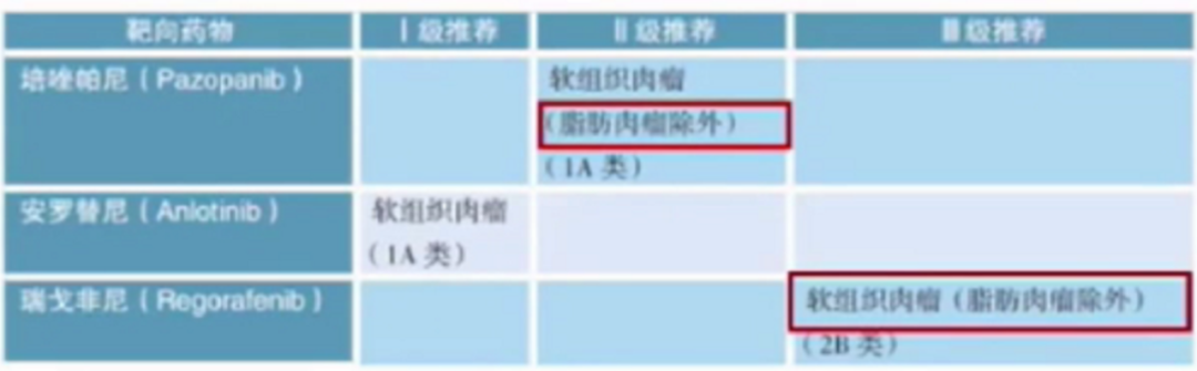 作为抗血管生成的多靶点TKI,培唑帕尼、瑞戈非尼均不推荐用于脂肪肉瘤的治疗,安罗替尼是目前唯一获得脂肪肉瘤二线治疗证据推荐的TKI。由于大部分WDLPS/DDLPS伴有CDK4/6基因的扩增,CSCO指南在脂肪肉瘤的靶向治疗推荐中,根据既往的II期研究结果,将哌柏西利作为III级推荐可用于WDLPS/DDLPS的一线治疗选择