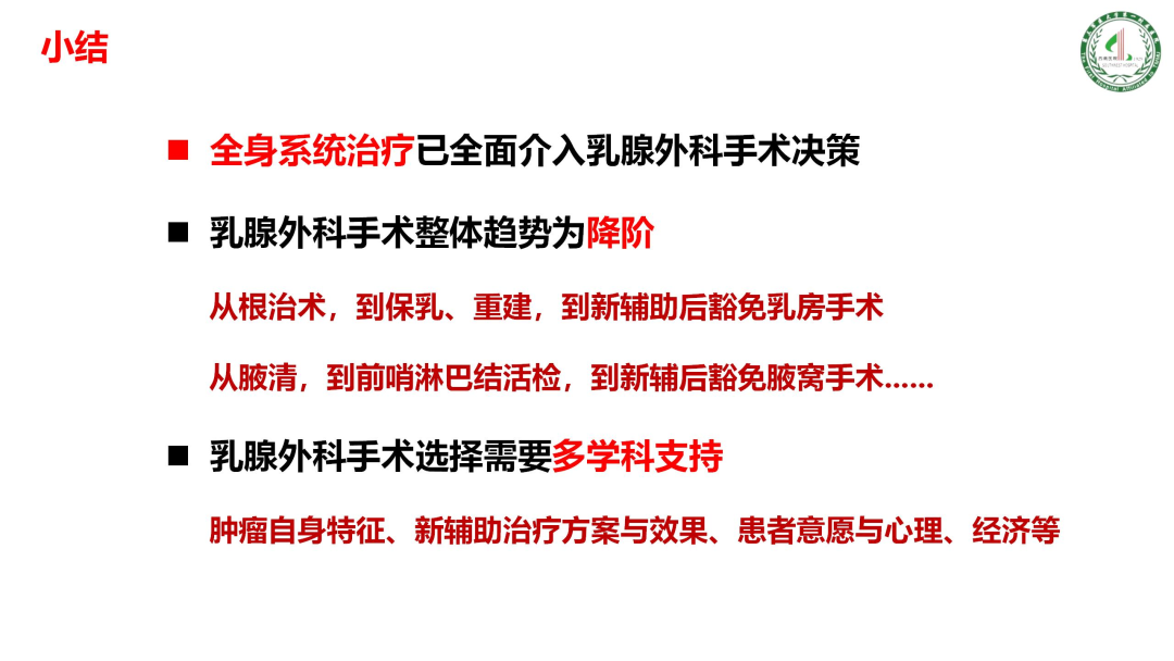 乳腺癌系统治疗正在快速发展,并已全面介入乳腺外科手术决策。齐晓伟教授最后总结到,目前乳腺外科手术的整体趋势是“降阶”,从根治术,到保乳、重建,到新辅助治疗后豁免乳房手术,从腋窝清扫到前哨淋巴结活检,再到新辅助治疗后豁免腋窝手术,有越来越多的研究探索已经或即将进一步改变乳癌外科处理的临床实践。随着这些变化和进展,乳腺外科也越来越强调多学科协作(MDT),根据肿瘤自身特征、新辅助治疗方案和效果、患者意愿和心理、经济等情况进行个体化决策。