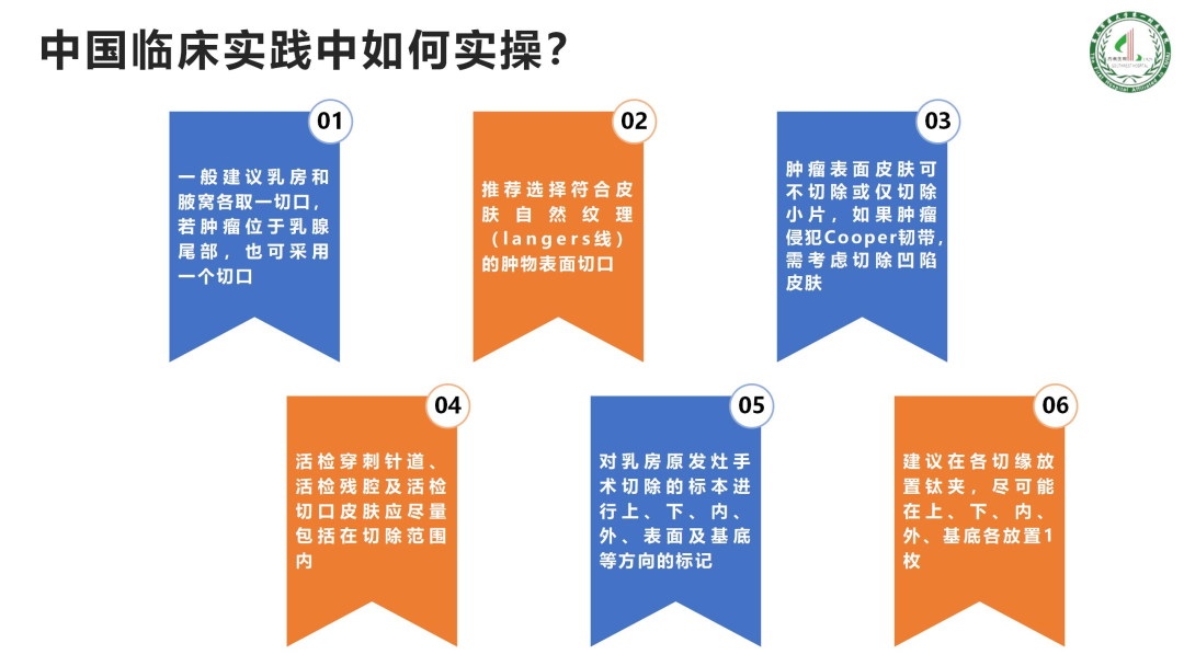 在保乳切口、切除范围、标记等临床实践操作方面,指南原文中是这样推荐的:(1)一般建议乳房和腋窝各取一切口,乳房尾部肿瘤也可取一个切口;(2)推荐选择符合皮肤自然纹理(Langers线)的肿瘤表面切口;(3)肿瘤表面皮肤可不切除或切除小片,若肿瘤侵犯Cooper韧带则需切除凹陷皮肤;(4)活检穿刺针道、残腔及活检切口皮肤应尽量切除;(5)对乳腺原发灶切除标本进行上、下、内、外、表面和基底等方向的标记;(6)建议在各切缘放置钛夹,尽可能在上、下、内、外、基底各放置1枚。