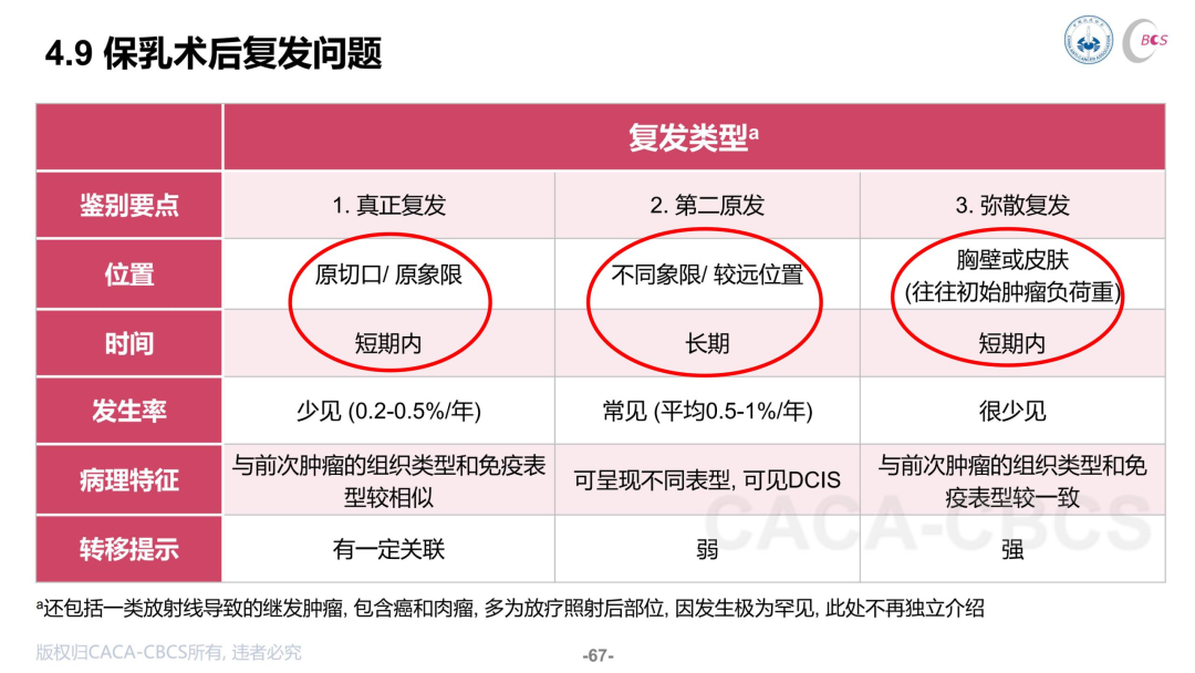 保乳术后复发主要包括三种情况:一是最常见的第二原发,主要在不同象限或较远位置,复发时间相对较长;二是少见的真正复发,主要在原切口或原象限,复发时间较短;三是较少见的弥散复发,主要在胸壁或皮肤,复发时间较短。