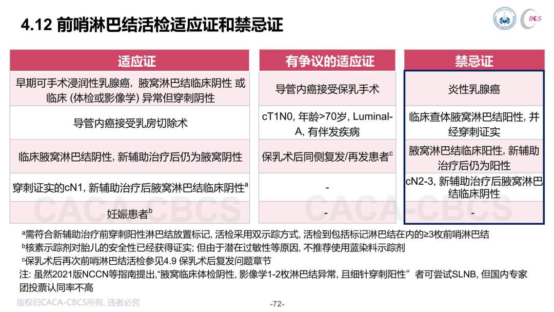 前哨淋巴结活检的适应症主要包括:(1)早期可手术浸润性乳腺癌,腋窝淋巴结临床阴性或临床(体检或影像学)异常但穿刺阴性;(2)导管内癌接受乳房切除术;(3)临床腋结阴性,新辅助治疗后仍为阴性;(4)穿刺证实的cN1,新辅助治疗后转为cN0。然而,炎性乳腺癌、临cN+且经穿刺证实、cN+且新辅助治落后仍为cN+、cN2-3且新辅助后cN0的患者为前哨活检的紧急正。此外,导管内癌接受保乳的患者,cT1N0、年龄>70岁、Luminal-A、有伴发疾病的患者,保乳术后同侧复发/再复发的患者进行前哨活检仍有争议。