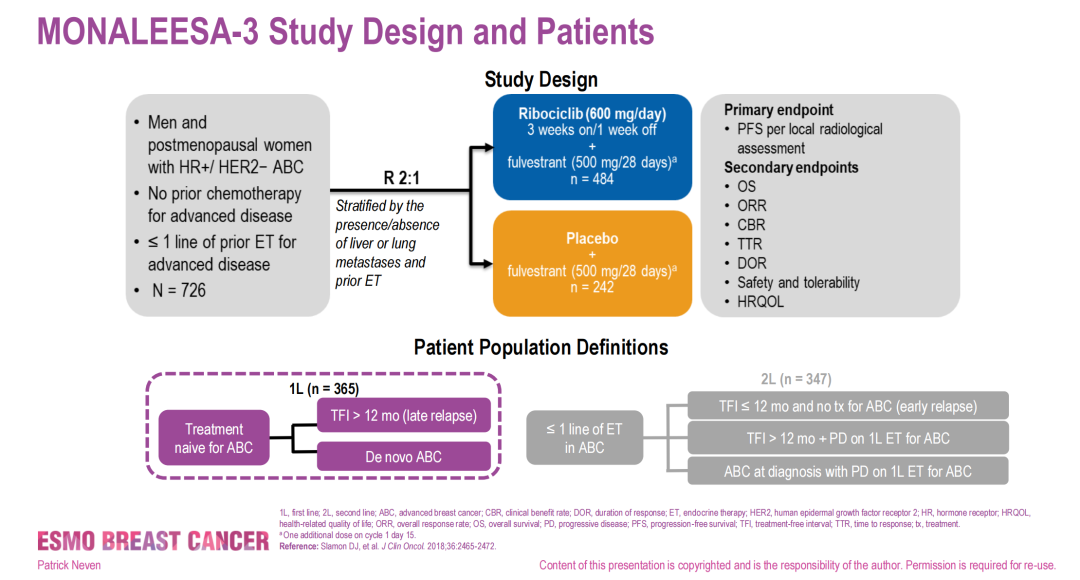 MONALEESA-3是首个用于评估CDK4/6抑制剂联合氟维司群一线治疗晚期乳腺癌的临床研究。该研究旨在评估Ribociclib+氟维司群用于绝经后HR+/HER2-晚期乳腺癌患者疗效的随机对照III期临床试验,其于2015年6月至2016年6月,在27个国家177家医院共入组一线或二线内分泌治疗的HR+/HER2-绝经后晚期乳腺癌患者726例,按2∶1的随机分配为Ribociclib+氟维司群组(n=484例)或安慰剂+氟维司群组(n=242例)。主要研究终点为当地医院评估的PFS,次要研究终点包括OS、ORR、CBR、TTR、DOR、安全性及耐受性、生活质量等。