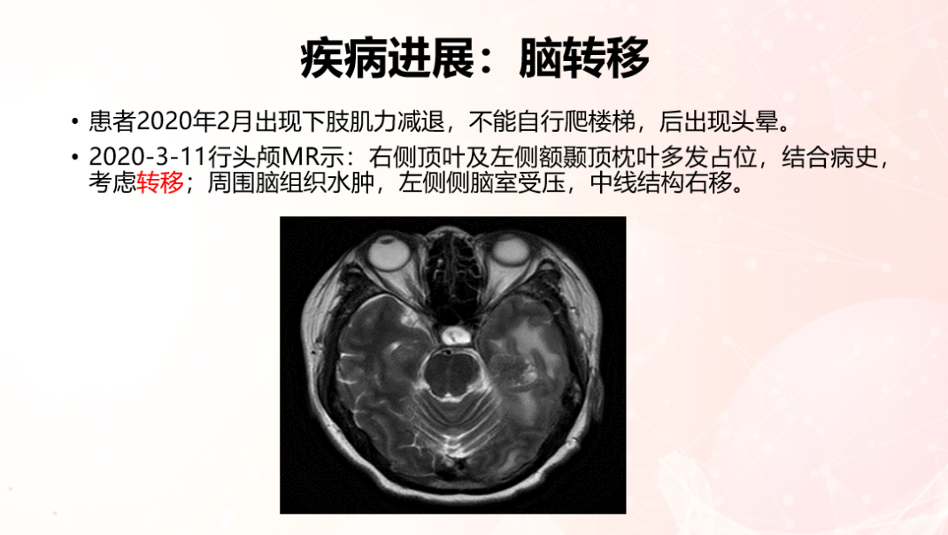王涛教授:该患者有活动性脑转移且有占位性症状,原则上应以局部治疗为主,局部治疗有两种方式,一种是请外科医生来判断是否能够进行局部肿瘤的切除,以缓解颅内水肿。另一种是进行放疗。闫敏教授的PERMEATE研究显示了TKI药物+卡培他滨对于脑转移的患者有很好的局控率,但该患者有占位性症状,有占位性症状和没有占位性症状的活动性脑转移不同,我想应该优先考虑局部治疗。