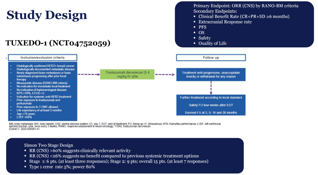 临床上,大多数活动性脑转移的患者需先进行局部治疗以控制疾病,后续再给予全身治疗。2022年ESMO BC大会上报道的一项前瞻性、单臂、Ⅱ期TUXEDO-1研究[4],则探讨了T-DXd用于活动性脑转移患者的疗效和安全性,入组患者为新诊断脑转移或接受过针对脑转移病灶的局部治疗而发生进展,但暂无立即进行局部治疗的指征。患者接受T-DXd(5.4 mg/kg IV q3w)直至进展或毒性不可耐受,主要终点是根据RANO-BM标准评估的颅内缓解率(RR)。