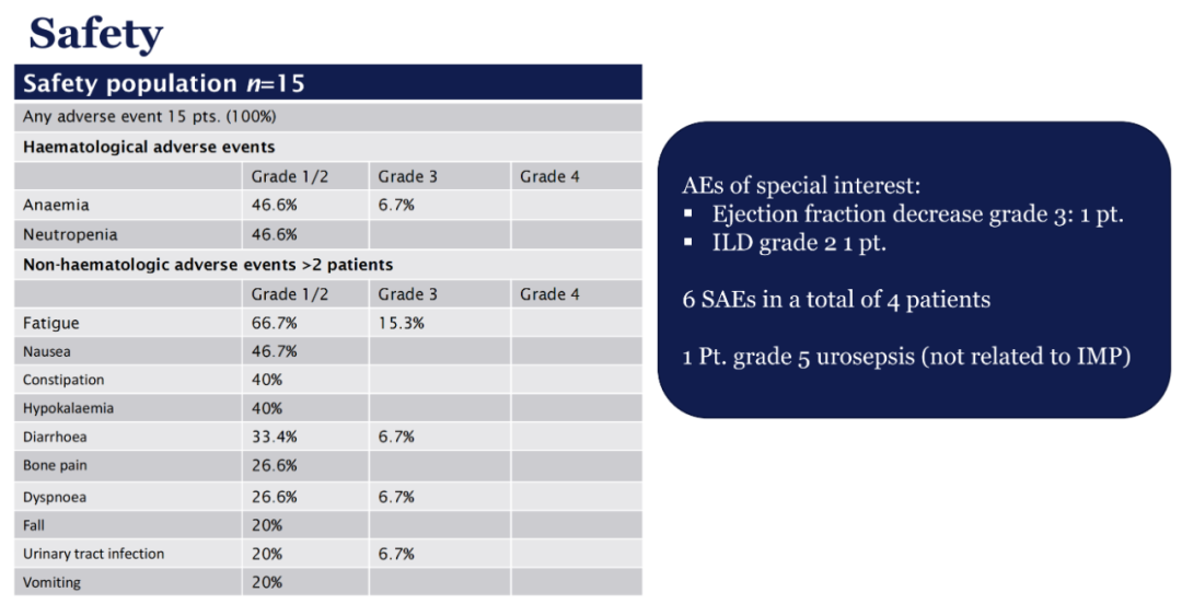 1/2级贫血和中性粒细胞减少发生率均为46.6%;主要的1/2级非血液学毒性包括疲劳(66.7%)、恶心(46.7%)和腹泻(33.4%)。9例患者发生过剂量减少;4例患者出现严重不良事件。有1例患者发生2级间质性肺病(ILD),1例患者发生3级左室射血分数下降。治疗期间,患者能够维持相应的生活质量(包括全球健康状态、躯体功能、情绪功能、认知功能)。
