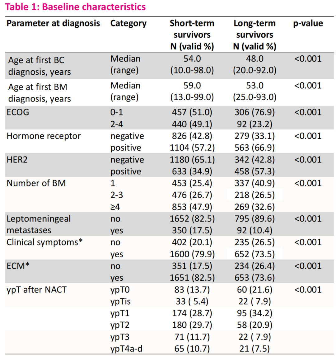 相较于短期生存者,长期生存者更年轻,脑转移诊断年龄更提前,体能状态更好,Luminal型和TNBC的比例更低,脑转移负荷更小,软脑膜转移比例更低,颅外转移(ECM)更少,有临床症状的比例更低,新辅助治疗后的pCR率更高。