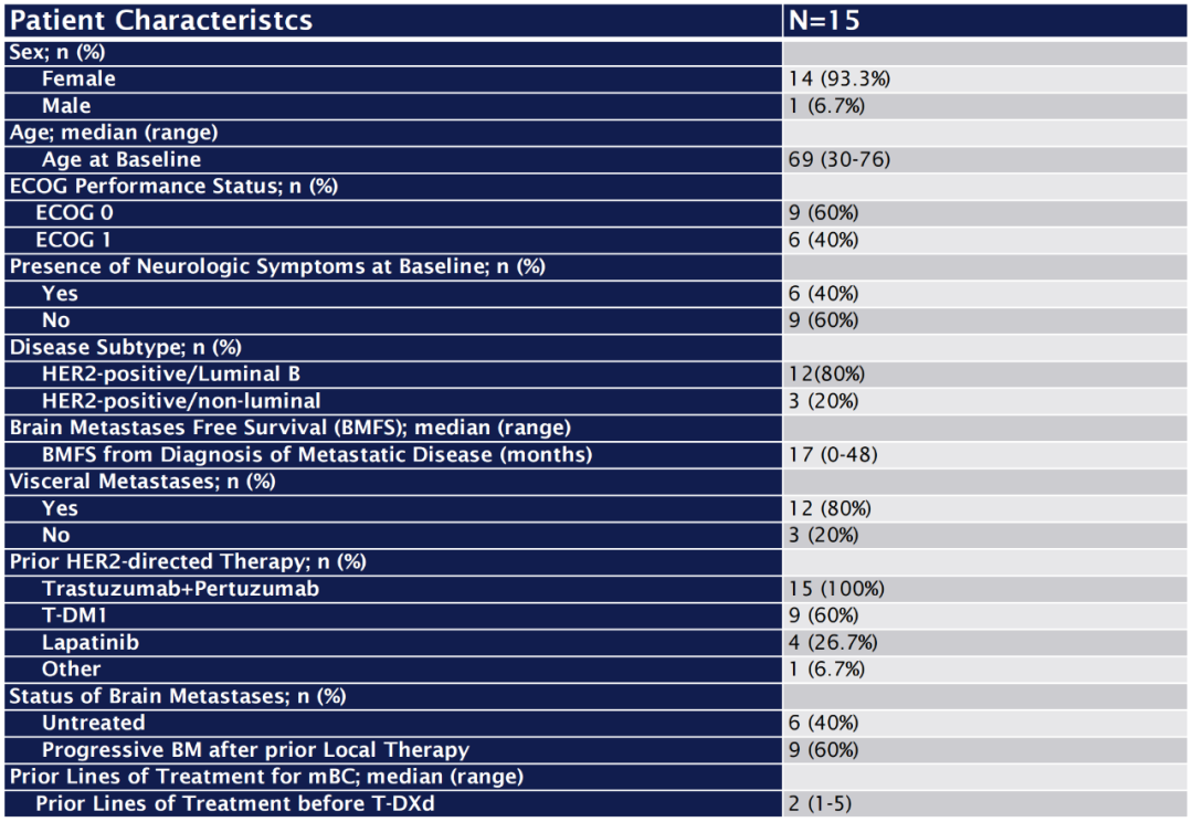 这15例患者均接受过曲帕双靶治疗,还有60%接受过T-DM1、26.7%接受过拉帕替尼治疗;大多数(60%)患者的脑转移病灶经过局部治疗后发生进展,另有40%的脑转移病灶未经治疗。这15例患者从诊断为转移性疾病开始的中位无脑转移生存时间为17个月,中位既往治疗线数为2。