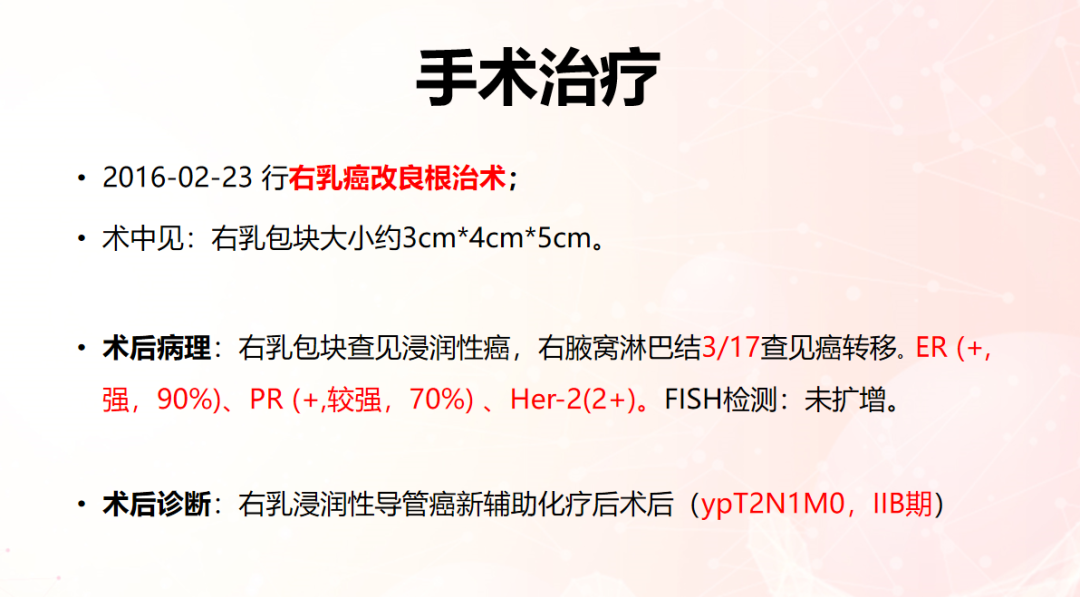 王涛教授:该患者转移前ER、PR均为强阳性,HER2阴性,转移后也为ER强阳性,按照当前的指南和规范,大家都会推荐患者使用CDK4/6抑制剂联合内分泌治疗的方案,因为患者目前没有内脏危象,仅有软组织转移,既往内分泌治疗敏感(来曲唑治疗两年后复发)。但患者复发转移时间在2018年,考虑当时CDK4/6抑制剂在我国不可及,基于这个原因,我也会考虑内分泌治疗,在当时环境下,有mTOR抑制剂可选择,如果患者由于经济原因或其他因素不可用,我也会推荐患者单用内分泌治疗(考虑SERD药物氟维司群)。