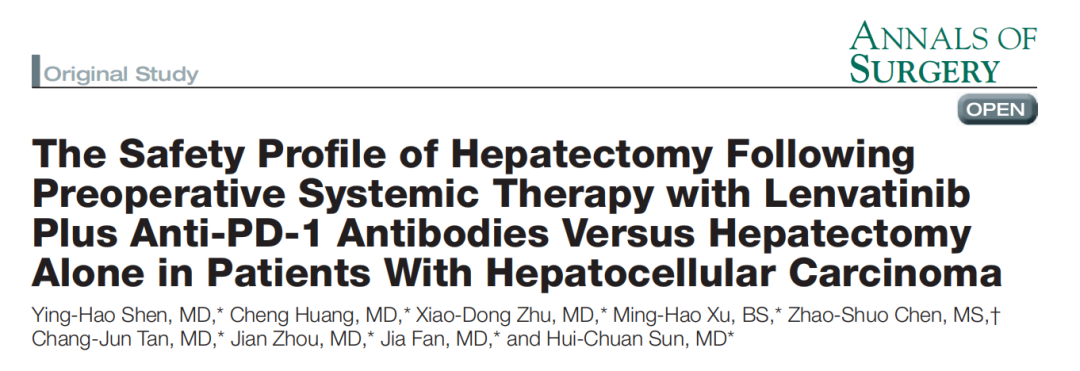 [8] Ying-Hao Shen, et al. The Safety Profile of Hepatectomy Following Preoperative Systemic Therapy with Lenvatinib Plus Anti-PD-1 Antibodies Versus Hepatectomy Alone in Patients With Hepatocellular Carcinom. Annals of Surgery Open: June 2022- Volume 3 - Issue 2 - p e163 . doi: 10.1097/AS9.0000000000000163