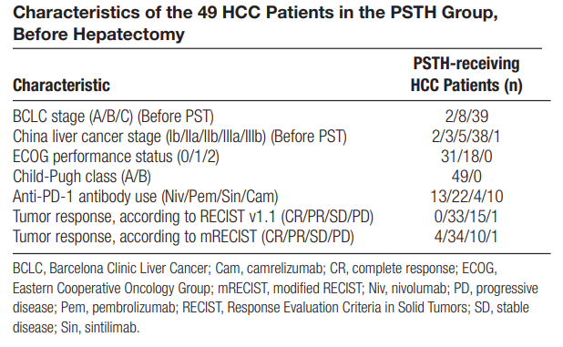 该研究结果显示,根据Clavien-Dindo标准,PSTH组相较于UH组术后30天主要并发症发生率无显著差异(PSTH组 vs UH组 36.7% vs 23.5%, P=0.203);PSTH组与UH组90天死亡率为1/49 vs 0/98,P=0.333,唯一一例死亡患者于术后2.4个月死亡,其原因可能是多器官的免疫反应。总体而言,转化治疗后的肝切除与直接肝切除的病人,在术后主要并发症的发生率无明显差异;在完善的术前评估基础上,仑伐替尼+PD-1转化治疗后手术切除是一种安全有效的治疗方案。