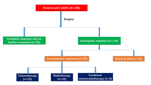 研究结果:经统计分析发现: ①纳入研究的所有患者(n=166)均行手术治疗,其中52例接受肿瘤的完全切除; 114例患者在肿瘤切除术后有残留病灶。在这114例患者中,61例选择等待观察; 53例接受进一步巩固治疗,包括局部放疗(n=22)、化疗(n=23)或放化疗联合治疗(n=8),详见下图。