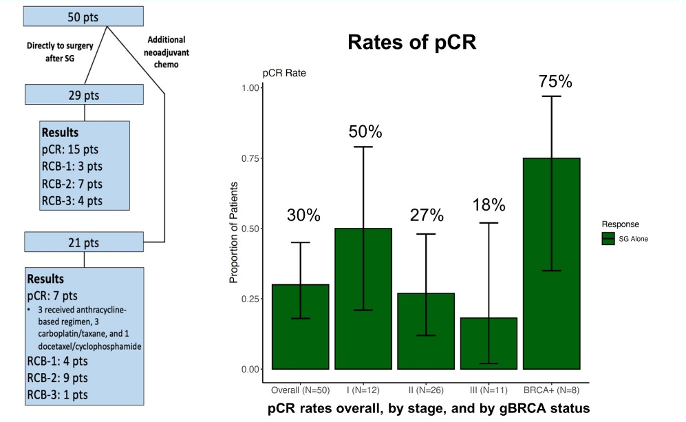 本次ASCO大会上披露了NeoSTAR研究戈沙妥珠单抗单药治疗组的结果。共计50名患者接受了戈沙妥珠单抗单药治疗,98%(n=49)的患者完成了4周期的新辅助治疗,影像学缓解率为42%(n=21/50, 95% CI:28%~57%)。29例患者接受4周期戈沙妥珠单药治疗后直接进行手术,pCR率为30% (n=15/50, 95% CI:18%~45%),其中Ⅰ期患者50%、Ⅱ期患者27%、Ⅲ期患者18%。在其余21例接受了额外新辅助治疗的患者中,7例达到pCR(3例使用蒽环方案,3例紫杉类/铂类方案,1例多西他赛/环磷酰胺方案)。在8例gBRCA突变的患者中,7例接受戈沙妥珠单抗单药治疗后直接手术,6例(75%,6/8)达到pCR。