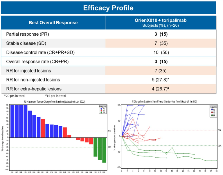 截止2022年1月,23例患者纳入研究。基线特征:中位年龄66岁;病理类型:黏膜60.9%,皮肤13.0%,原发不明13.0%,肢端13.0%;基因突变状态:BRAF 17.4%,NRAS 4.3%;69.6%伴肝外转移:局部或远处淋巴结转移56.3%,肺转移37.5%,骨转移31.3%;LDH>ULN 26.1%;注射病灶的平均大小:35mm(10-94mm);中位肝转移数目:7(1-10);中位注射次数:10(3-36)。20例患者疗效可评估。中位PFS为3.4个月,中位OS为21.5个月。ORR为15%(3/20),DCR为50%(10/20);注射病灶有效率为35%(7/20),非注射病灶有效率为27.8%(5/18),肝外转移有效率为26.7%(4/15)。术后8至12周对15例进行活检以确定TIL情况。其中,具有显著TIL浸润(根据AJCC第8版的定义,活跃n=4和非活跃n=3)的患者(7/15)的中位PFS为9.2个月,而没有显著TIL浸润为4.1个月。21.7%(2例PR和3例SD)患者活检中无黑色素瘤细胞残留,中位PFS为13.8个月,远长于其他患者的5.6个月。无黑色素瘤细胞患者的中位OS为19.7个月。研究提示特瑞普利单抗静脉给药联合肝内OrienX010瘤内注射治疗在黑色素瘤肝转移的患者中显示出显著的PFS和OS延长。