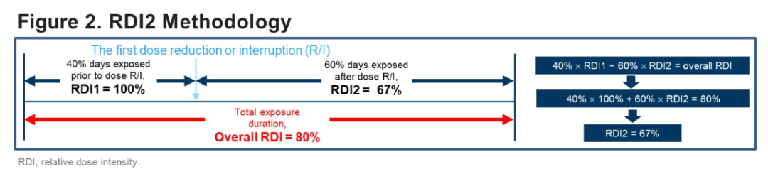 两个时间相关变量包括剂量减少(RIB 600 mg起始剂量,有/无剂量调整)和相对剂量强度2(RDI2)作为协变量包含在各自模型中,来探索对OS的影响。考虑到第一次给药的时间差异,RDI2反映了剂量调整后与OS的相关性,使用改良的Kaplan-Meier方法获得中位OS(mOS)数据。