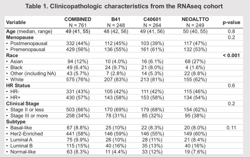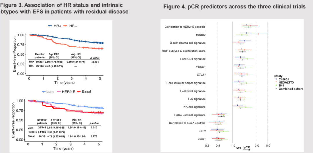 该研究通过联合分析CALGB 40601,NeoALTTO和NSABP B-41试验这三项关于新辅助治疗的Ⅲ期临床试验来评估乳腺癌不同内在亚型、基因表达特征与病理完全缓解(pCR)、无事件生存(EFS)的相关性。