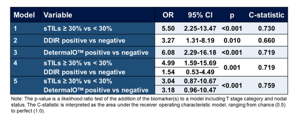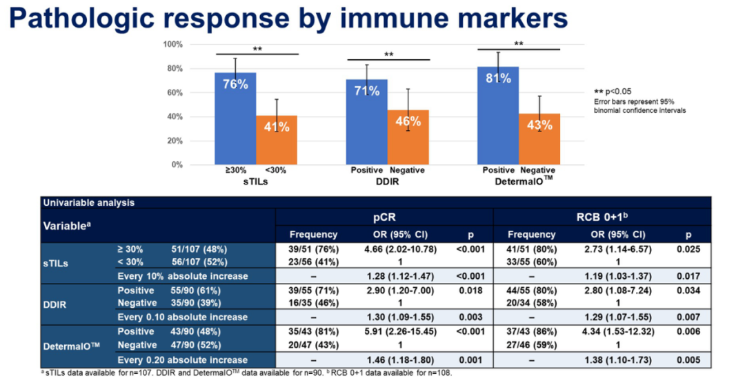 pCR率和RCB 0-1率分别为60%(95%CI:51%~70%)和71%(95%CI:62%~80%)。12%的患者因治疗相关的不良事件终止治疗。28%的患者发生免疫相关不良事件(≥3级:6%)。47%的患者sTILs>30%,48%为DetermalO阳性,61%为DDIR阳性。下图描述了这些生物标志物对pCR和RCB的影响。