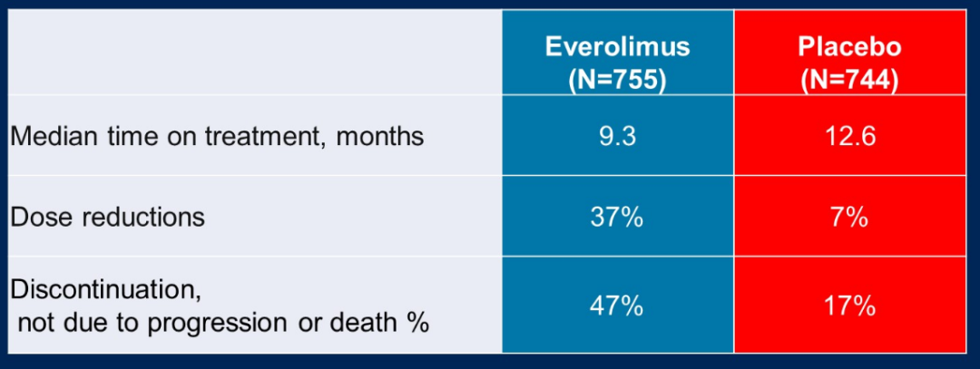 为患者找到合适的治疗窗口是很重要的。我们在这项研究中就遇到许多患者停药的问题,依维莫司组只有45%的患者完成1年疗程,而安慰剂组是69%。依维莫司组有37%的患者因为药物副作用而减剂量,有47%发生停药。当然,包括其他小分子TKI辅助治疗的5项研究中,试验组的停药率也非常高。尽管许多患者停药,但我们仍可以看到治疗获益,这表明也许辅助靶向治疗的疗程可以更短。未来我们希望通过更多研究,探索出最佳的药物剂量、治疗持续时间,让患者更容易接受治疗。