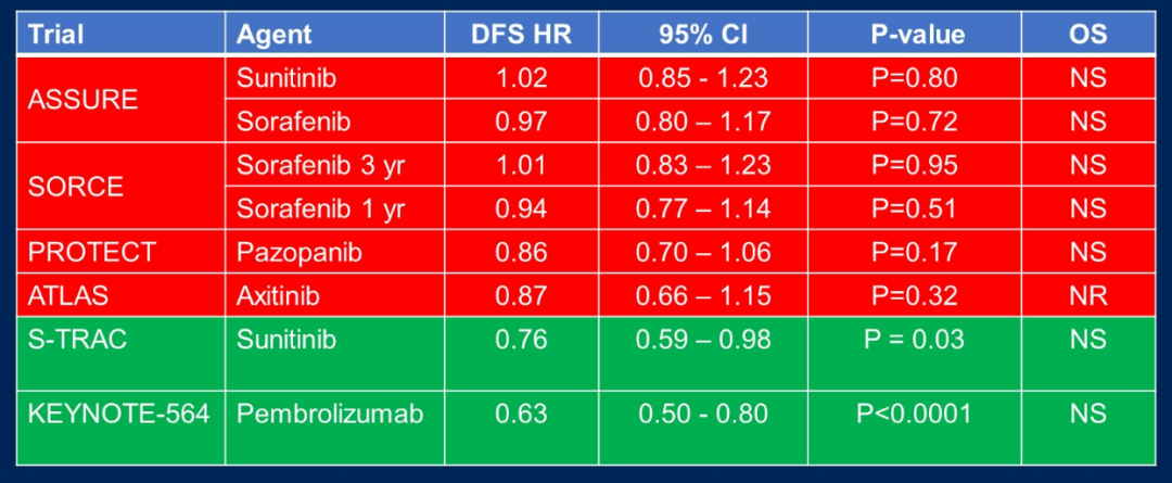 在过去四年里,还有另外两项获得阳性结果的辅助治疗研究,包括舒尼替尼的S-TRAC研究和帕博丽珠单抗的KEYNOTE-564研究。S-TRAC也是五项TKI试验中唯一获得阳性结果的,但人们对其治疗获益表示怀疑。所以舒尼替尼的肾癌辅助治疗在美国已经获得批准,但在欧洲并没有获批。S-TRAC、KEYNOTE-564这两项研究都仅仅纳入了ccRCC患者,而且是T3期以上的更高危患者。EVEREST纳入患者更宽,是目前唯一一项包括了nccRCC在内并取得接近阳性结果的研究。未来我们希望在更大样本的研究中观察针对mTOR通路,看看有没有可以预测疗效的生物标志物。让我们拭目以待。