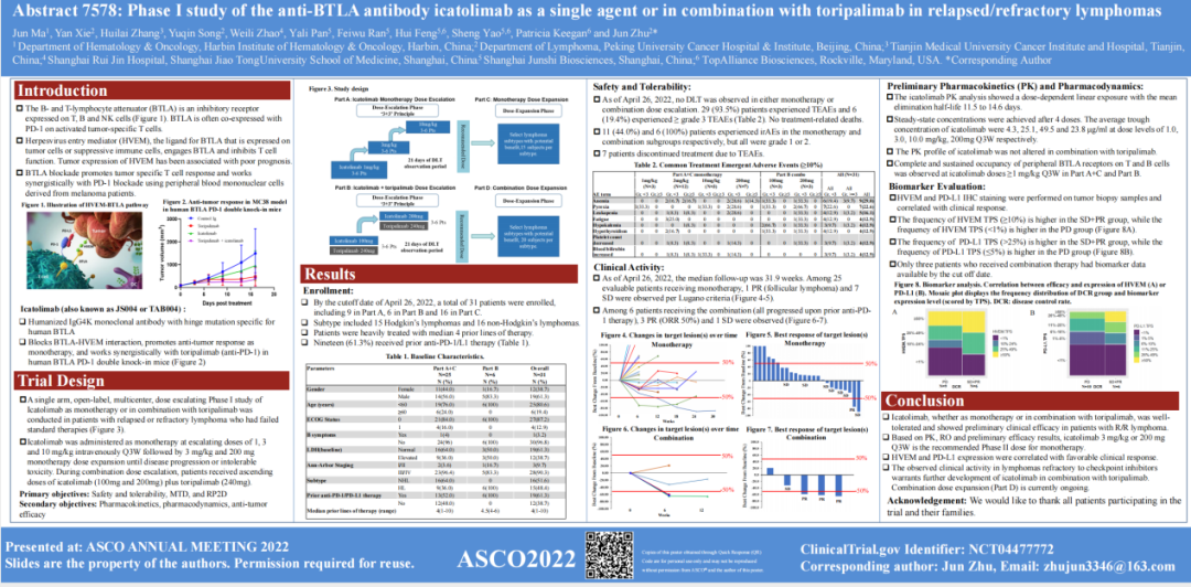 抗BTLA抗体icatolimab(JS004或TAB004)是一重组人源化IgG4κ单克隆抗体,具有铰链突变(S228P),可结合BTLA并阻断其与其配体HVEM的相互作用。在2022年6月3日-7日召开的美国临床肿瘤学会(ASCO)年会上,哈尔滨血液病肿瘤研究所马军教授(第一作者、报告人)和北京大学肿瘤医院朱军教授(通讯作者)领衔报道了一项关于icatolimab的首次人体研究(Hall A,北京时间2022年6月4日下午9:00 –上午12:00,大会摘要号:7578),旨在考察icatolimab单药或联合特瑞普利单抗在复发/难治性(R/R)淋巴瘤患者中的安全性和抗肿瘤活性。本刊特邀请马军教授为我们深入介绍该项研究的成果及其临床意义。