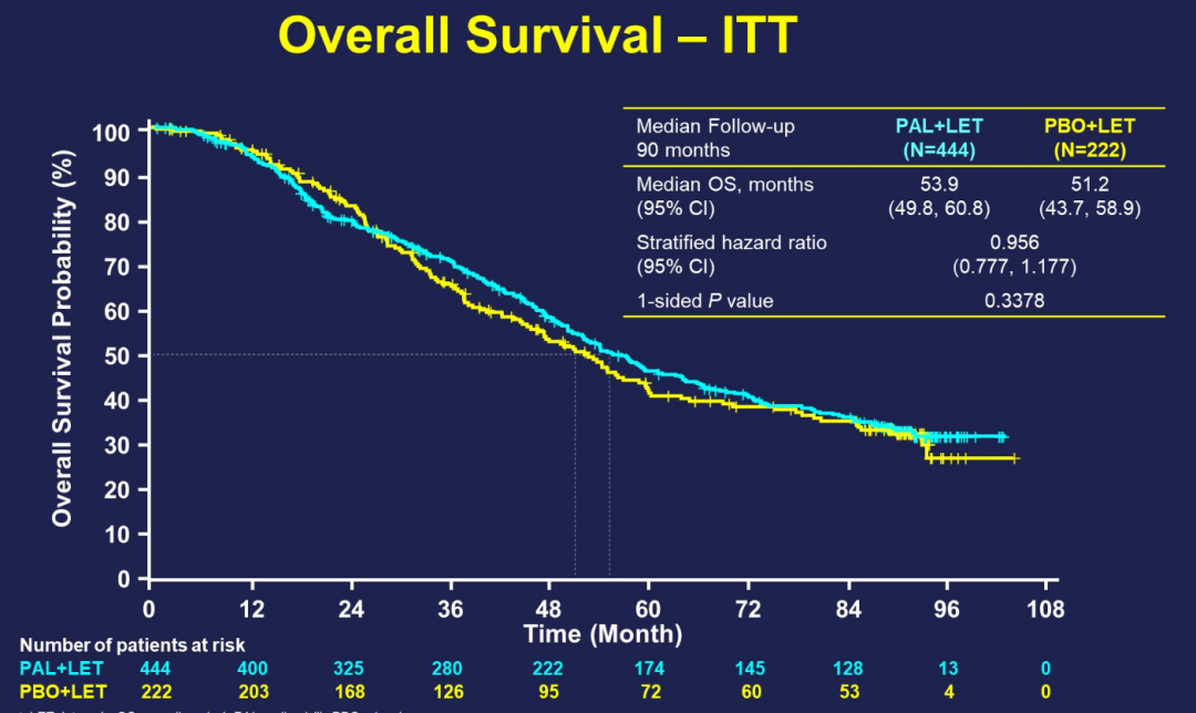中位随访时间为90个月,PAL+LET组和LET组患者的中位OS没有显著差异(53.9 vs 51.2个月;HR 0.956,95%CI:0.777~1.177;P=0.3378)。排除掉撤出研究或失访患者(分别有21%和13%)的事后敏感性分析显示,PAL+LET组和LET组的OS分别为51.6个月和44.6个月(HR 0.869,95%CI:0.706~1.069)。