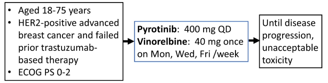 研究背景:随着曲妥珠单抗在HER2阳性乳腺癌成为基石类药物而广泛应用,曲妥珠单抗治疗耐药后二线治疗的优化选择成为研究热点。2018年9月,中国原研TKI类抗HER2靶向治疗药物吡咯替尼以其突出的Ⅱ期临床试验结果获得国家快速审批上市。两个Ⅲ期临床研究PHENIX和PHOEBE研究进一步确定了曲妥珠单抗经治后晚期乳腺癌患者,吡咯替尼联合卡培他滨确切的PFS获益及OS获益,成为曲妥珠单抗耐药后优选方案。本研究旨在探索全新双口服方案,吡咯替尼联合长春瑞滨节拍化疗治疗曲妥珠单抗治疗失败的HER2阳性晚期乳腺癌的疗效和安全性。