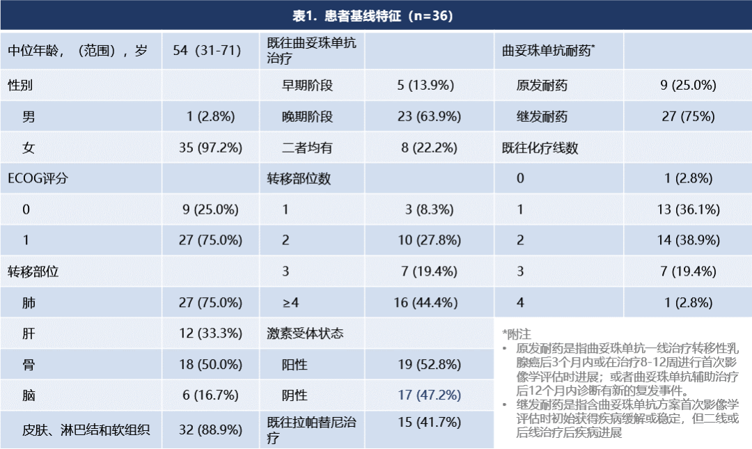 该研究入组了36例曲妥珠单抗治疗失败HER2阳性晚期乳腺癌,25%患者为曲妥珠单抗原发耐药,75%为继发耐药,且41.7%患者既往接受过拉帕替尼联合卡培他滨。转移部位≥3个的患者63.8%,主要转移部位为淋巴结转移、骨、肺。治疗线次≥3线的患者占比61.1%。患者特征既包含了曲妥珠单抗耐药人群,又有较高比例的TKI跨线应用。