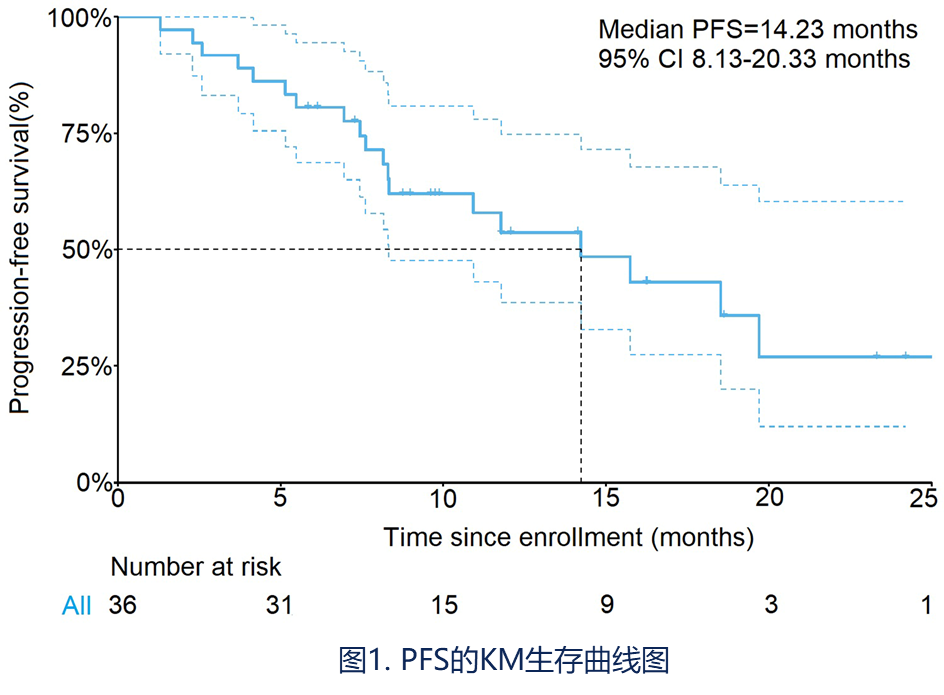 中位随访时间为16.23个月,20名患者发生疾病进展或死亡事件。中位PFS为14.23个月(95%CI:8.13~20.33),OS数据尚不成熟,ORR和DCR分别为38.9%和83.3%。
