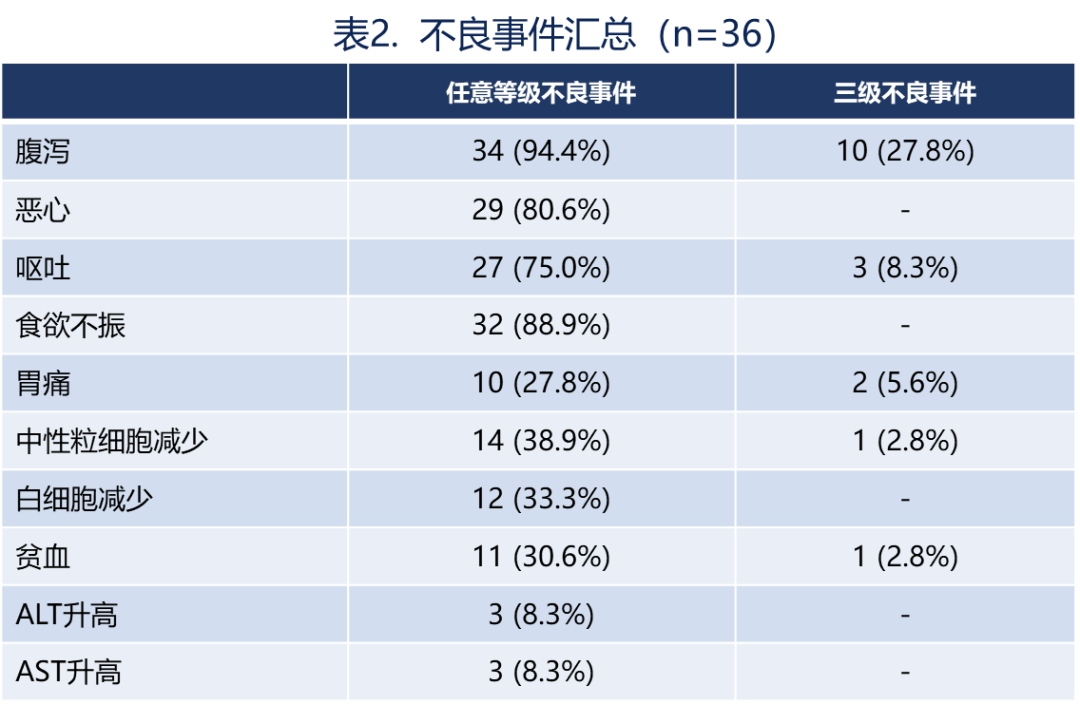 47.22%(17/36)患者发生三级不良事件,无患者发生四级及以上不良事件。