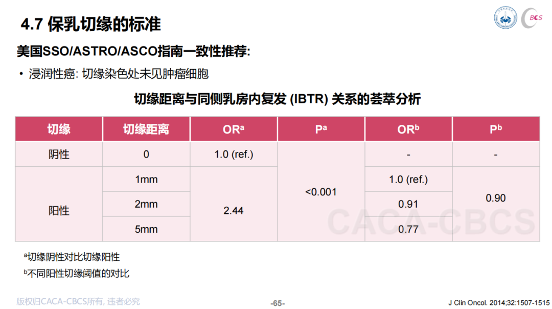范照青教授:保乳手术标本切下来后,需要进行切缘取材,切缘阴性意味着保乳成功。SSO/ASTRO/ASCO等国际指南一致推荐,浸润性癌的切缘染色处未见肿瘤细胞即可,即“no ink on tumor”的原则。因为有荟萃分析显示,切缘阴性(切缘距离为0mm)不会增加同侧乳房内复发(IBTR)风险,而扩大切缘安全距离(>1mm)并不会降低IBTR风险。