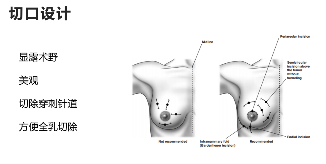 范照青教授:新版CBCS指南对切口选择、设计也给出很好的建议,比如沿着Langer氏线进行切口设计,总体上的切口设计要求是能够很好地显露术野、达到美观、切除穿刺针道、方便全乳切除等。