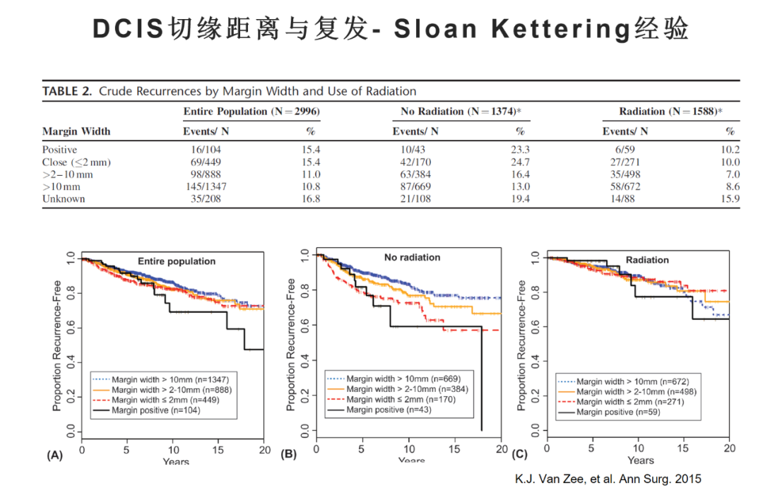 对于国内更常用的“切缘离断取材”是否安全、可行?我们中心前些年统计的数据显示,8年同侧乳房内肿瘤复发率仅为3%,每年仅有不到0.4%的复发率,可见是安全可行的。当然,临床上大家对DCIS的安全切缘仍有顾虑。从MSKCC发表于Ann Surg的经验来看,在接受放疗的情况下,切缘距离和复发率没有相关性。实际上,在病理、外科、放疗等MDT团队比较强的情况下,DCIS似乎也不用特别强调2mm的切缘距离。当然,这样的经验还不适合在医疗条件差异较大的地区推广,中国医生还是应该遵循CBCS指南的推荐进行规范化处理。