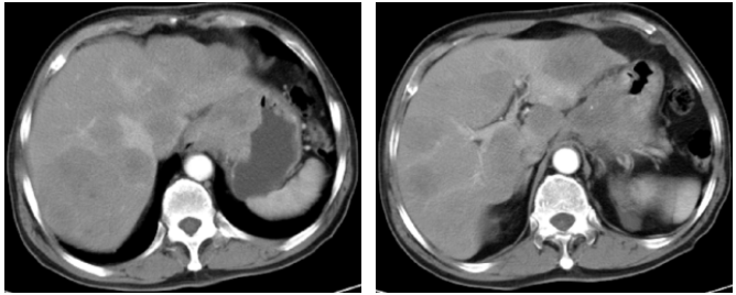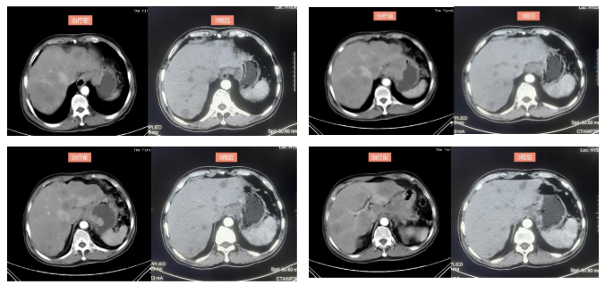 2022-4-13复查上腹部CT(3疗程后):符合贲门-胃体癌表现,伴肝内多发转移瘤,病灶均较前明显缩小,疗效评价PR。