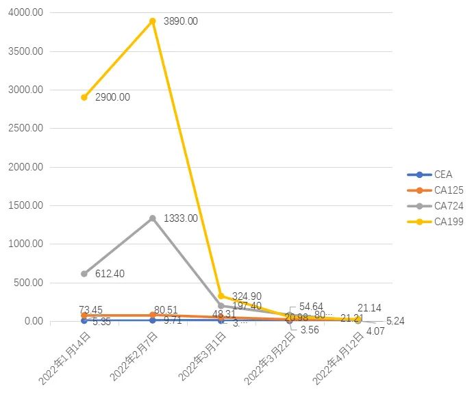 2022-1-14肿瘤标志物:CEA 5.35ng/mL,CA199 2900U/mL,CA125 73.45U/mL;CA724 612.4U/mL。