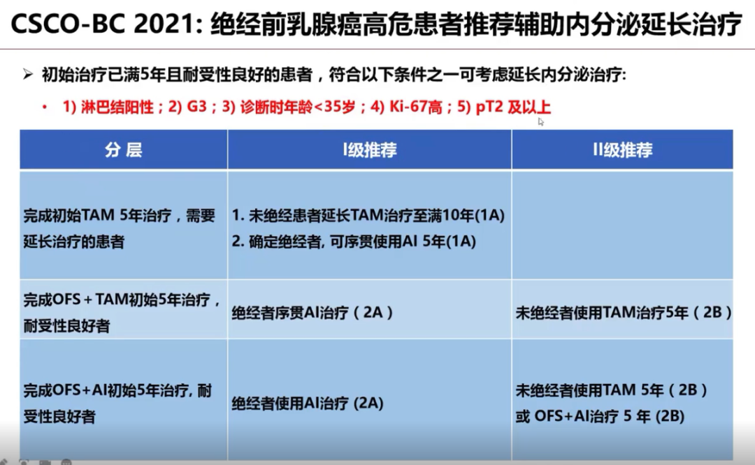 对于中高危患者,延长内分泌治疗观念已经逐渐成为主流,ATLAS、aTTom、MA.17、MA.17R、ABCSG 6a等研究结果均体现了延长内分泌治疗的生存获益。2021版CSCO指南已经根据患者年龄和危险因素,对延长内分泌治疗做出明确推荐。