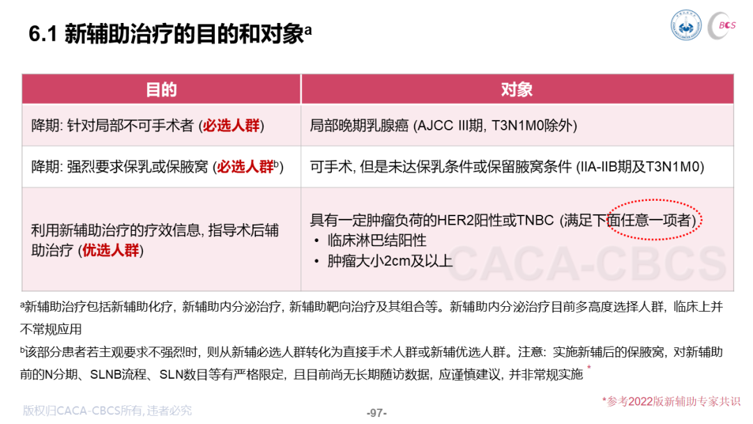 新辅助治疗包括新辅助化疗、新辅助内分泌治疗、新辅助靶向治疗及其组合等。新辅助治疗的目的是:①降期:针对局部不可手术者(必选人群)或强烈要求保乳或保腋窝(必选人群);②利用新辅助治疗的疗效信息,指导术后辅助治疗(优选人群)。新辅助治疗的对象是:①必选人群—局部晚期乳腺癌(AJCC Ⅲ期,T3N1M0除外);可手术,但是未达到保乳条件或保留腋窝条件(ⅡA-ⅡB期及T3N1M0);②优选人群—具有一定肿瘤负荷的HER2阳性或TNBC(满足下面任意一项者):临床淋巴结阳性、肿瘤大小2cm及以上。