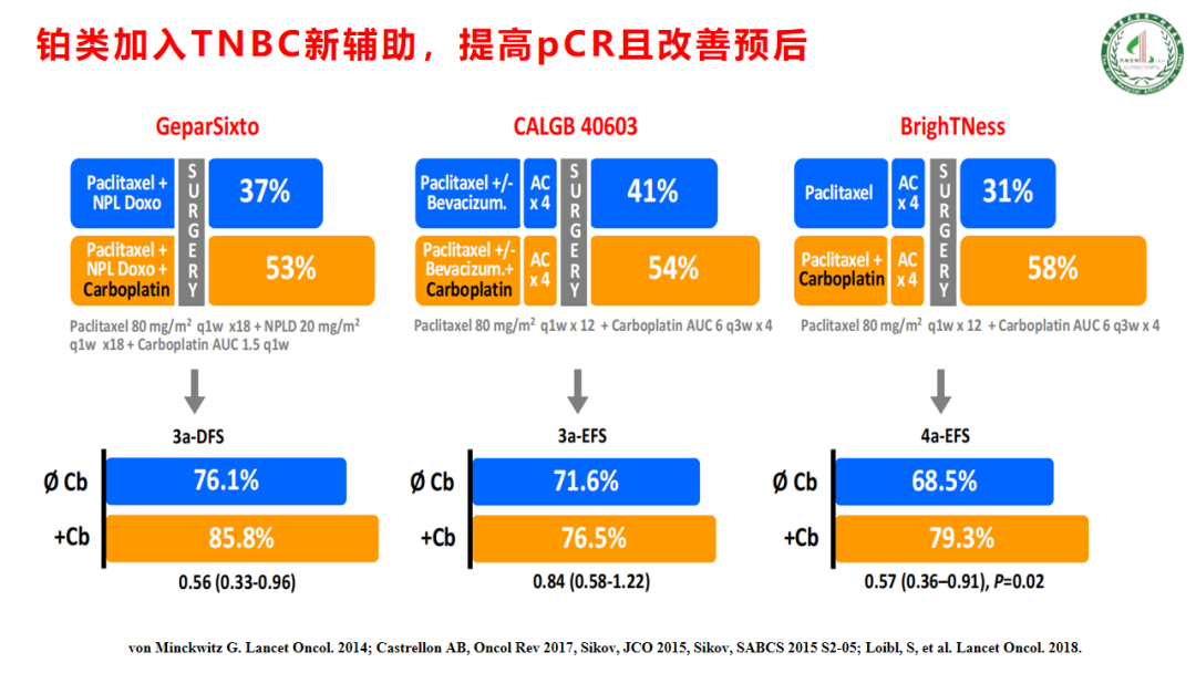 2、TNBC的新辅助治疗方案:紫杉蒽环是基础,同时铂类的重要性也日益凸显,无论是GeparSixto研究,还是CALGB 40603研究,以及BrighTNess研究,均能够看到,在紫杉蒽环的基础上加入铂类,tpCR均有显著提高,同时,随着最新研究数据的公布,可以看到,加入铂类患者的长期生存也能够得到显著的提高,可以改善患者的预后。