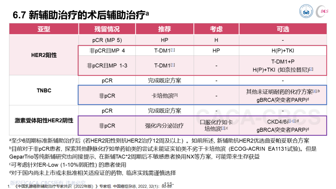 HER2阳性的乳腺癌新辅助pCR的术后推荐继续使用HP方案,TNBC在新辅助取得pCR后术后推荐完成既定方案,激素受体阳性患者同样是推荐完成既定方案。